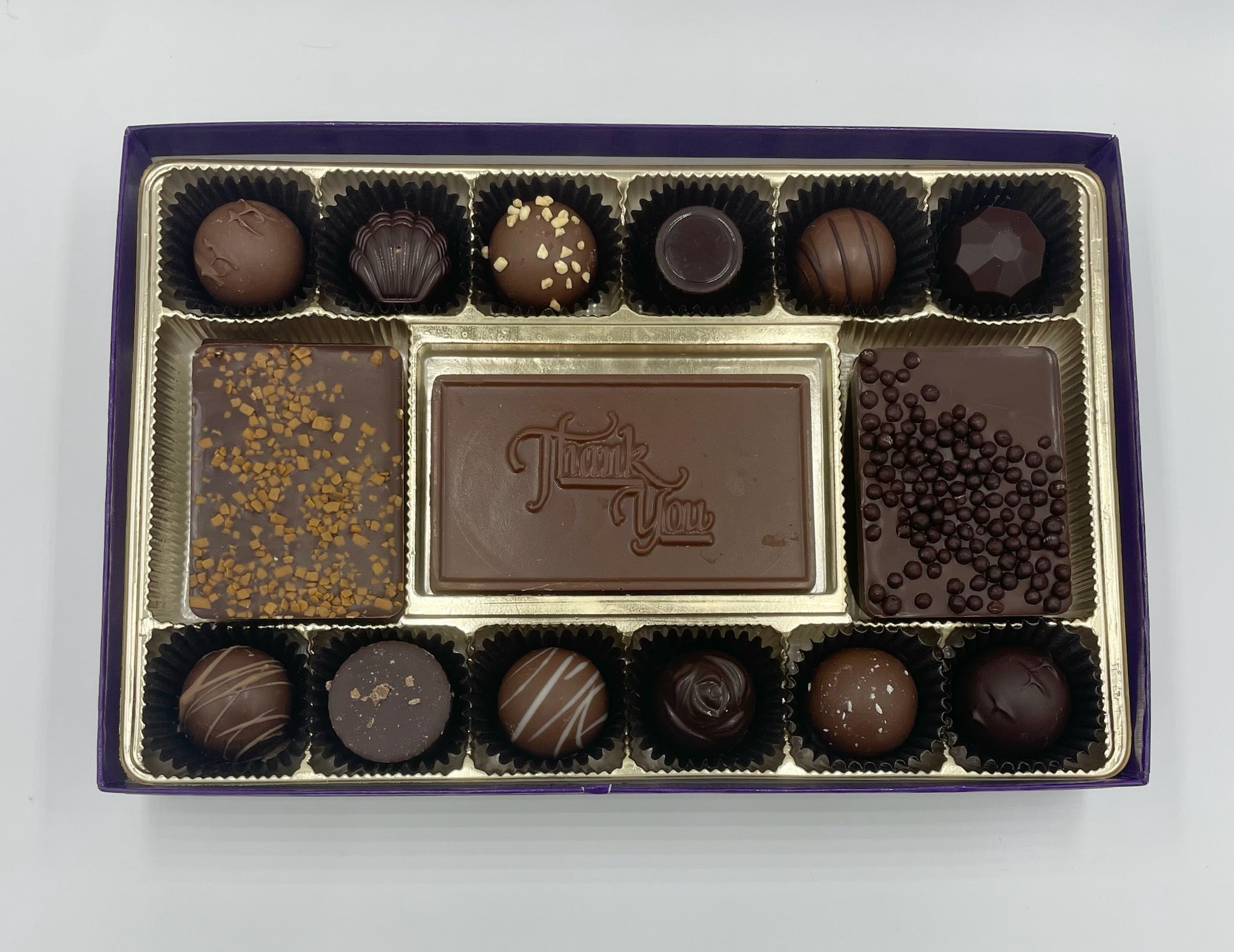 What better way to say “thank you” than with a box of fine Swiss Chocolates? Our Thank You Gift Box is filled with 12 assorted Swiss truffles and chocolates, 2 chocolate confections, and one hand-molded chocolate Thank You bar prominently displayed in the center. This box is bound to make its recipient feel appreciated!